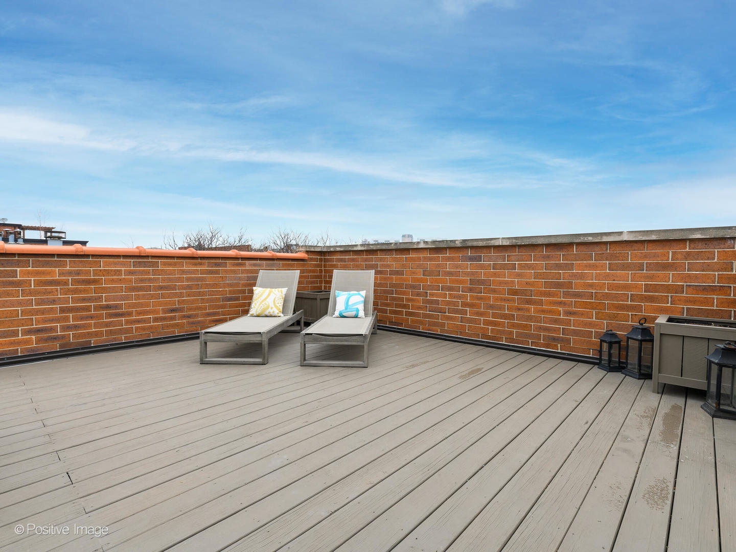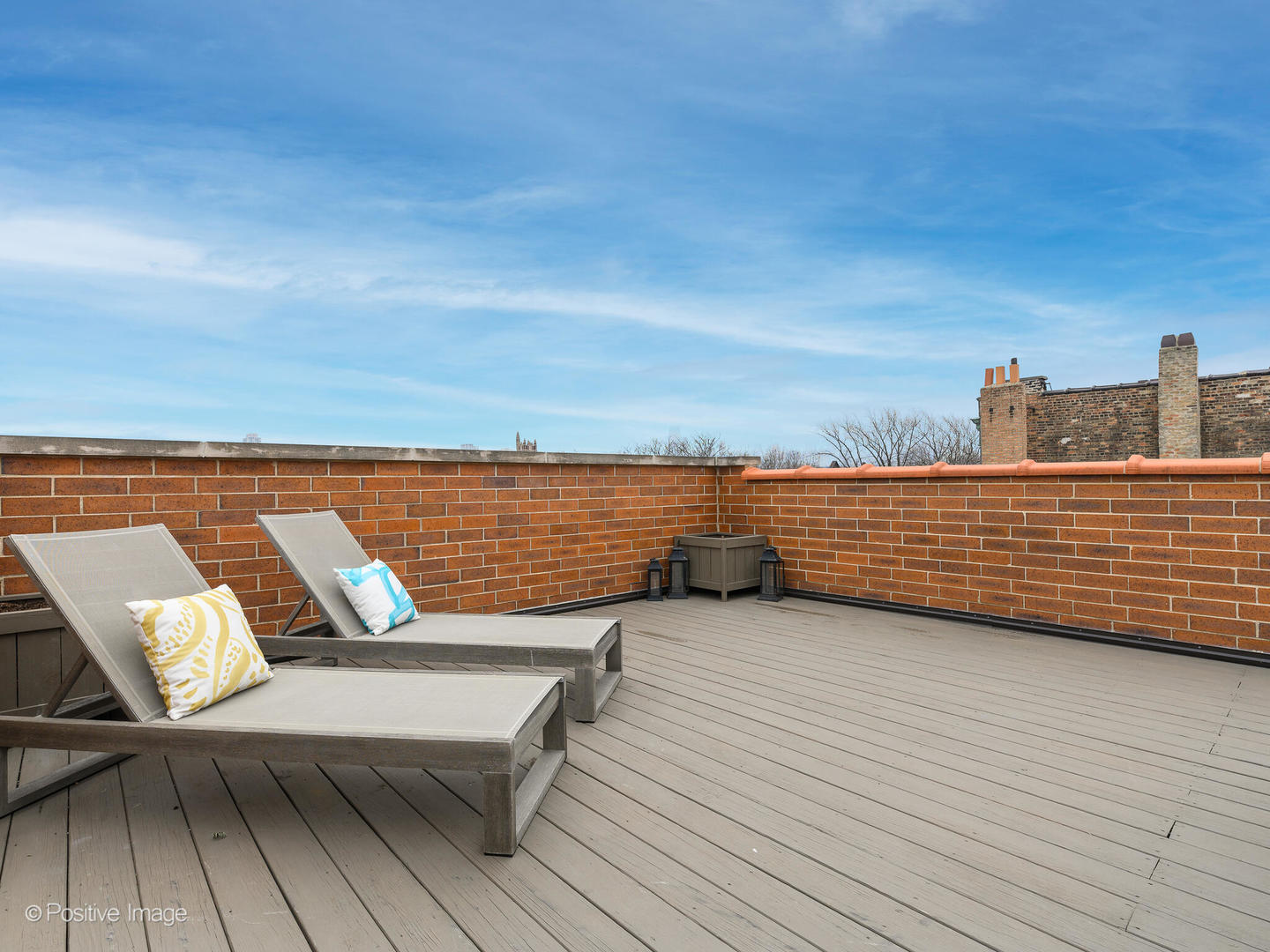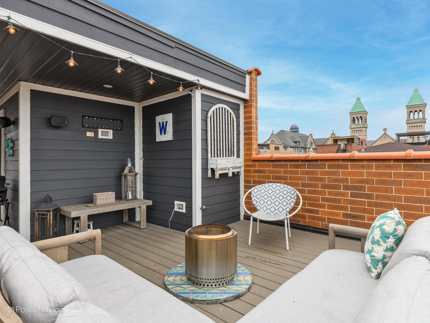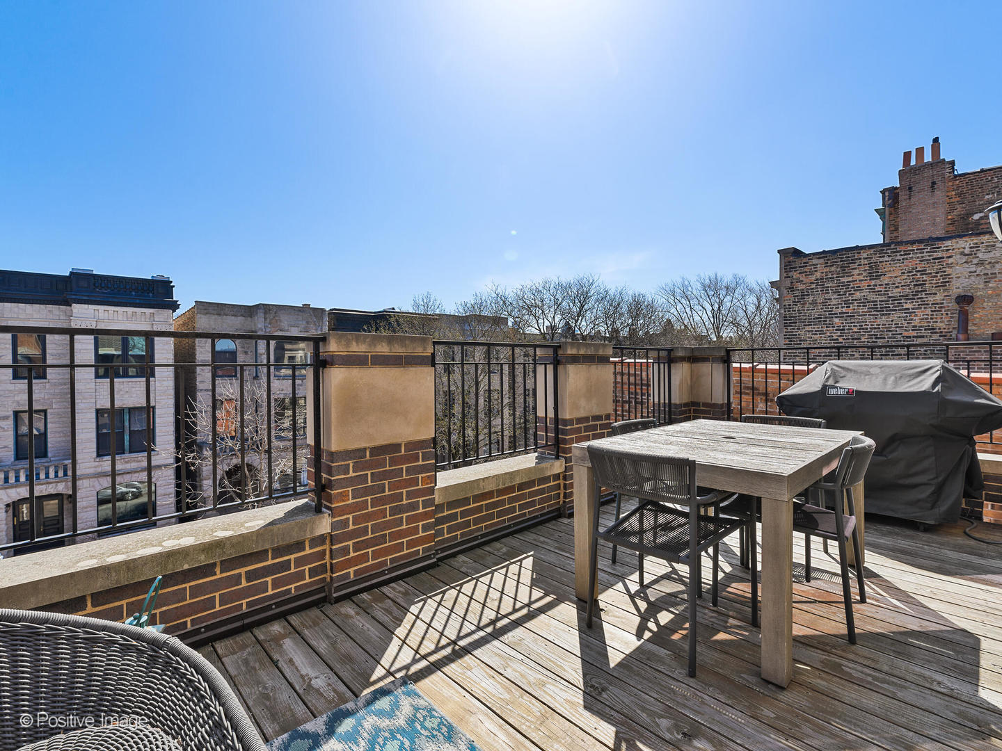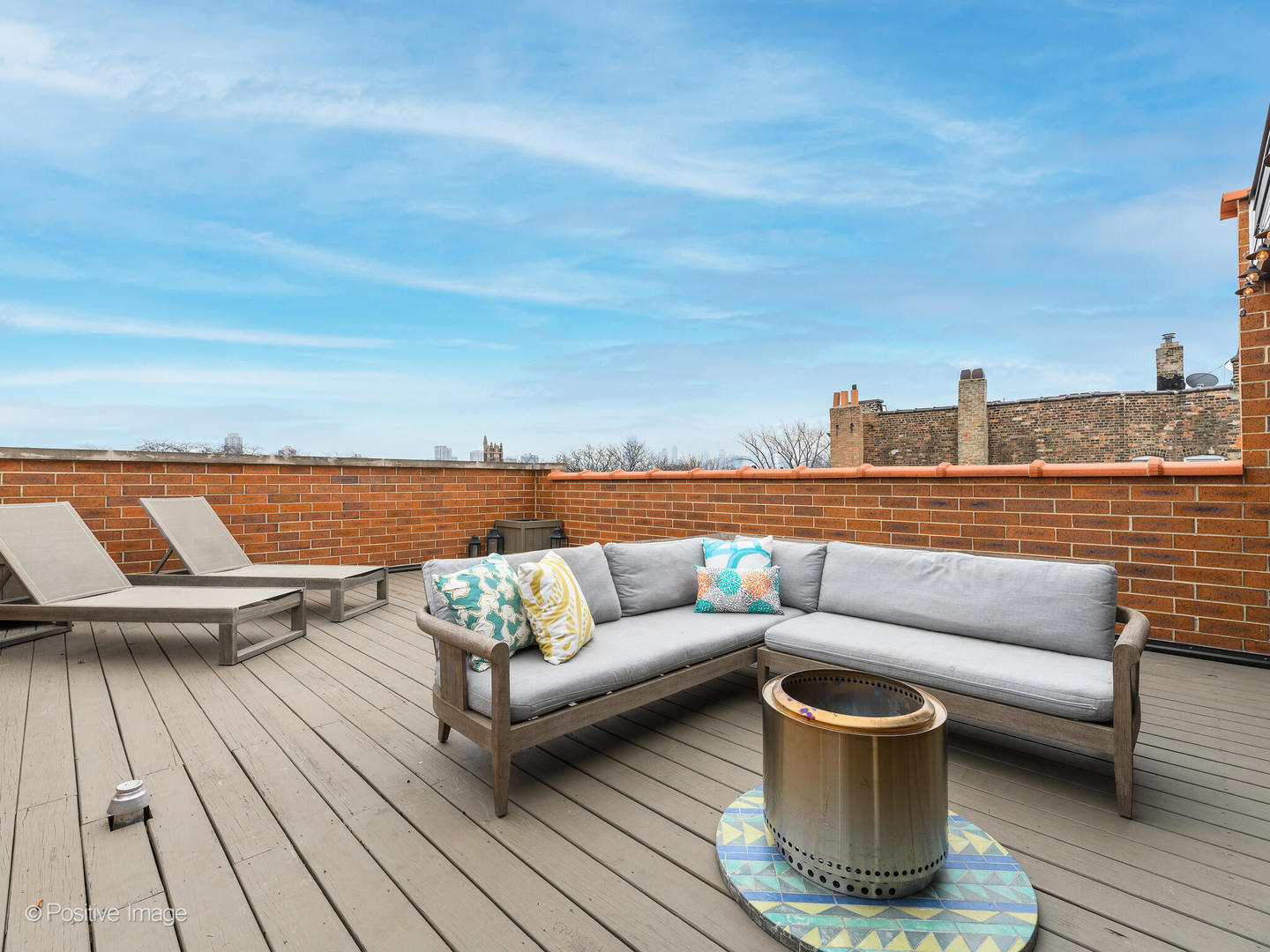 Fabulous opportunity for a like-new construction top floor condo in a happening Lincoln Park location. This stylish, well-built home offers a desirable living room layout with classic built-ins surrounding a gas fireplace, and ample space for a dining table. The living and dining areas open onto a front terrace that spans the width of the entire building for an unbelievable entertaining or grilling space. The open kitchen features quartz countertops and top end stainless appliances. There is also bar seating for informal dining. A spacious primary suite offers a walk-in closet and bath w/steam shower, body sprays, and double sinks. There is a good sized second bedroom and a well-appointed hall bath. The penthouse level is the perfect office or sitting room with a dry bar and wine fridge and offers direct access to the exclusive rooftop deck. A portion of the deck is covered, making it usable in any weather, and is also wired for sound and gas - a truly fabulous space to entertain and host. Hardwood flooring throughout and laundry complete this fab home. Garage parking for one car included. This location cannot be beat and is walking distance to fantastic shopping and dining along Armitage, Webster, and Sheffield and in Oscar Mayer School!