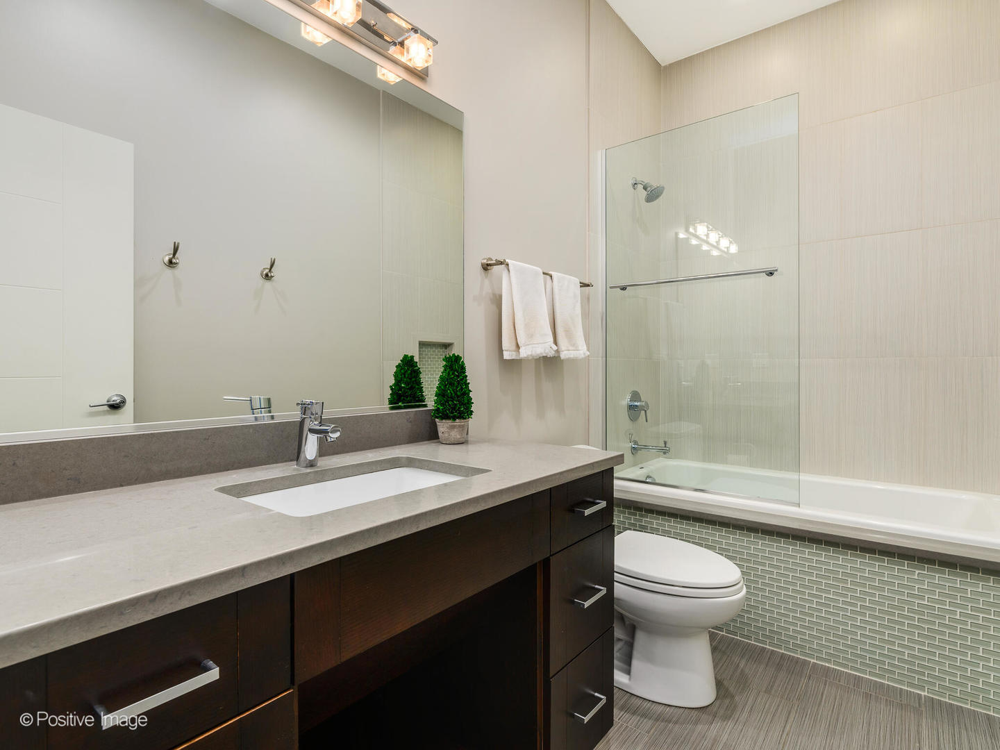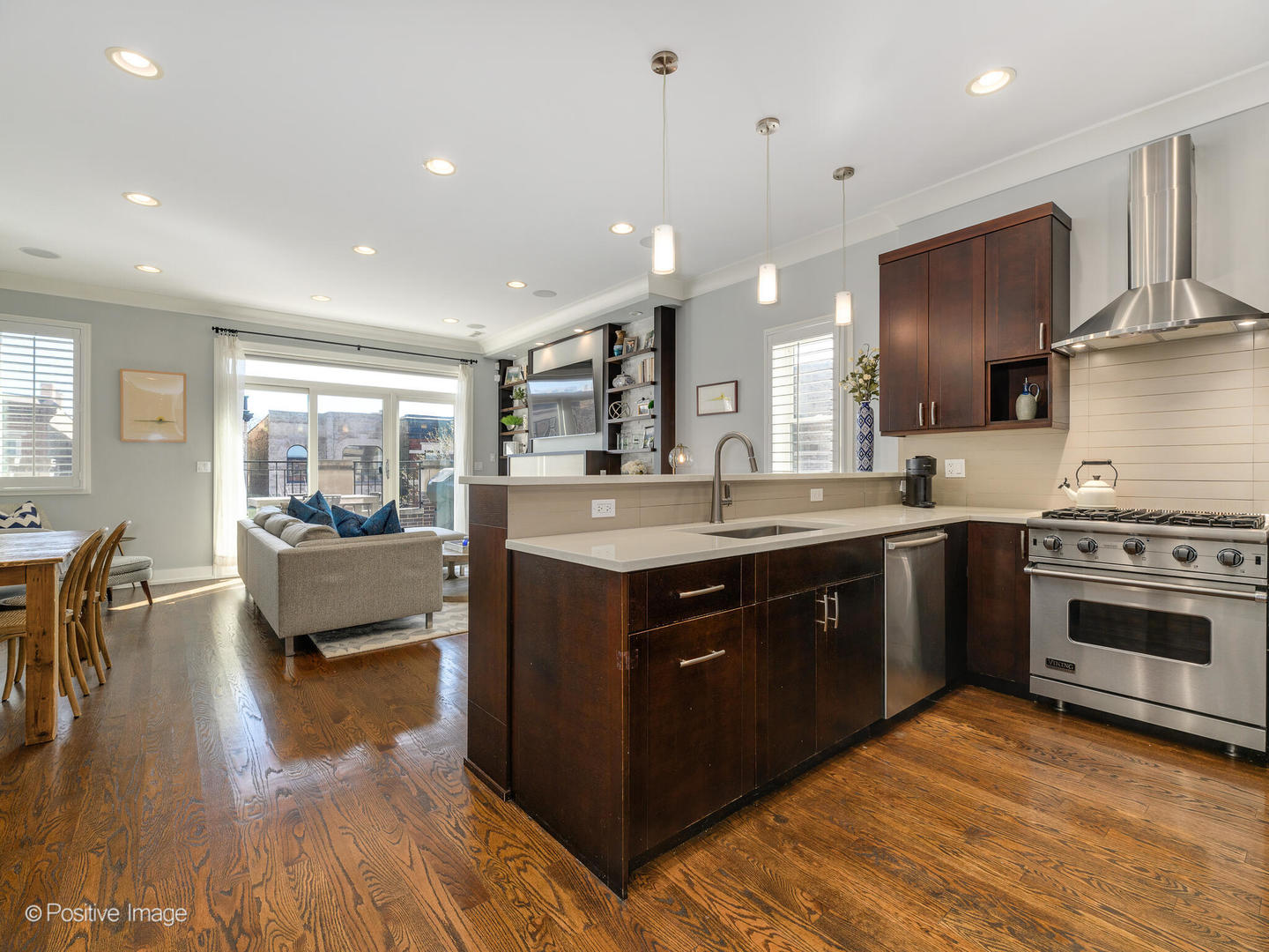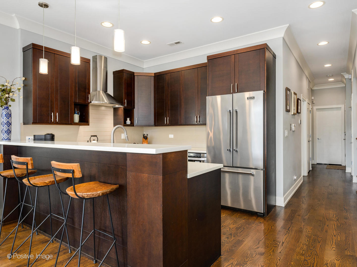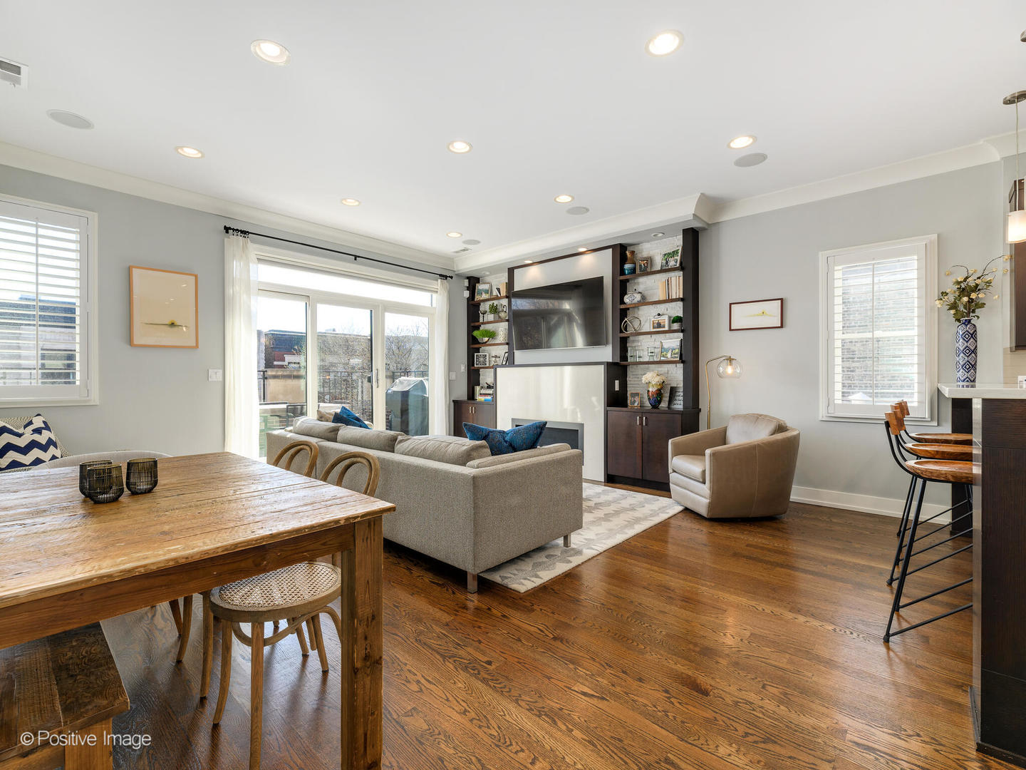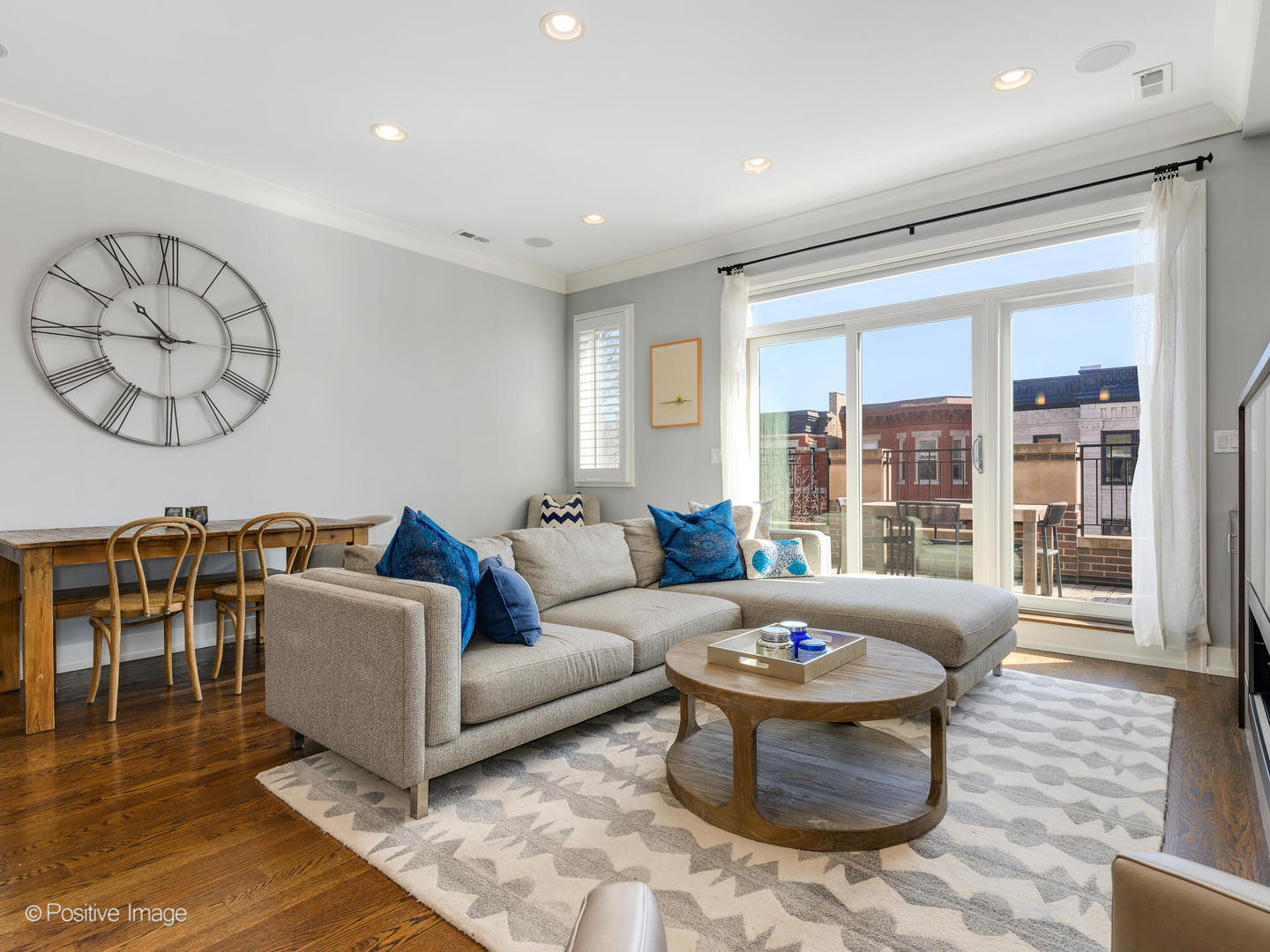 Fabulous opportunity for a like-new construction top floor condo in a happening Lincoln Park location. This stylish, well-built home offers a desirable living room layout with classic built-ins surrounding a gas fireplace, and ample space for a dining table. The living and dining areas open onto a front terrace that spans the width of the entire building for an unbelievable entertaining or grilling space. The open kitchen features quartz countertops and top end stainless appliances. There is also bar seating for informal dining. A spacious primary suite offers a walk-in closet and bath w/steam shower, body sprays, and double sinks. There is a good sized second bedroom and a well-appointed hall bath. The penthouse level is the perfect office or sitting room with a dry bar and wine fridge and offers direct access to the exclusive rooftop deck. A portion of the deck is covered, making it usable in any weather, and is also wired for sound and gas - a truly fabulous space to entertain and host. Hardwood flooring throughout and laundry complete this fab home. Garage parking for one car included. This location cannot be beat and is walking distance to fantastic shopping and dining along Armitage, Webster, and Sheffield and in Oscar Mayer School!