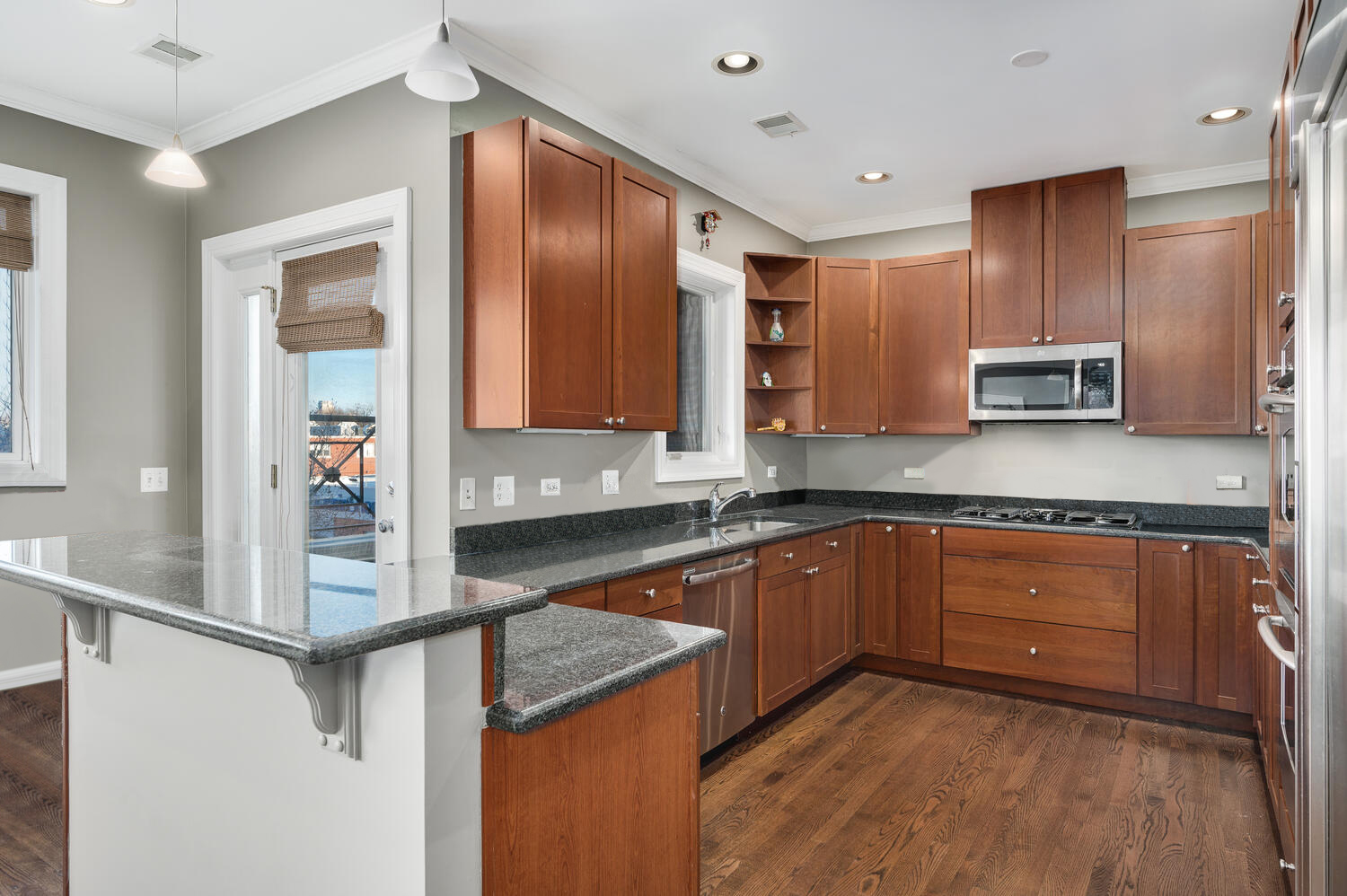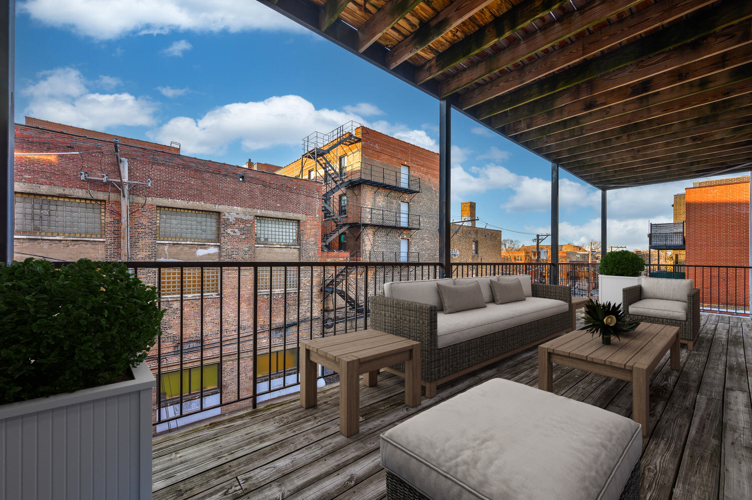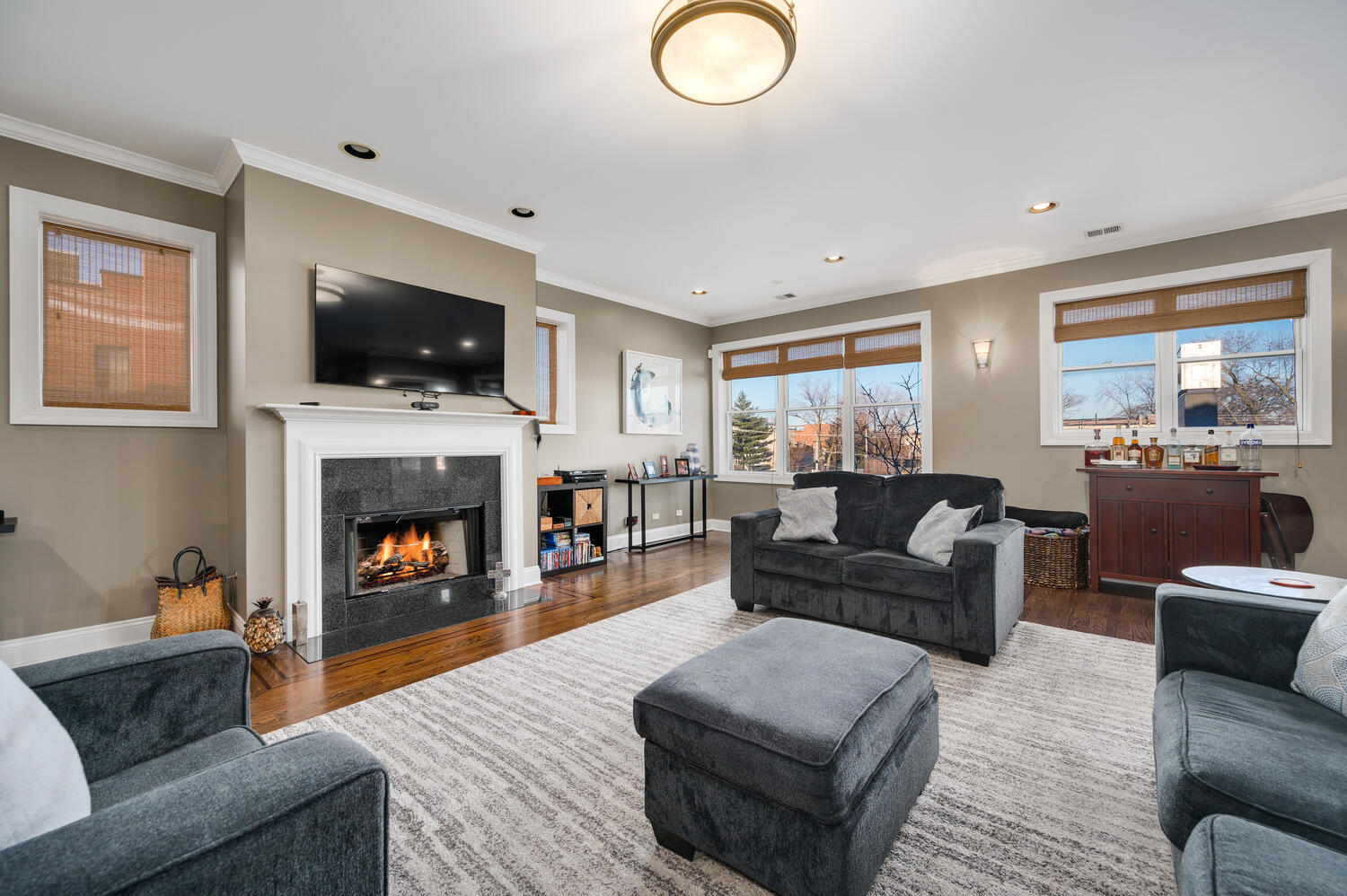 Extra wide three bedroom plus den condo in the heart of Chicago's iconic Southport Corridor/Lake View neighborhood. This 2400 square foot home has amazing outdoor spaces and THREE car parking! Beautifully upgraded kitchen with all stainless appliances and ample cabinetry. Extra wide, open floor plan in the living room dining, kitchen makes this feel like a super wide lot home, all with access to one of two outdoor spaces. The primary suite offers a great walk-in closet and a beautiful spa-like bath. Two additional generously sized bedrooms, one is ensuite, and access to a large west-facing terrace that spans the great width of the home. Located in the Hamilton school district, a half block from Whole Foods, and walking distance to the Brown line train.