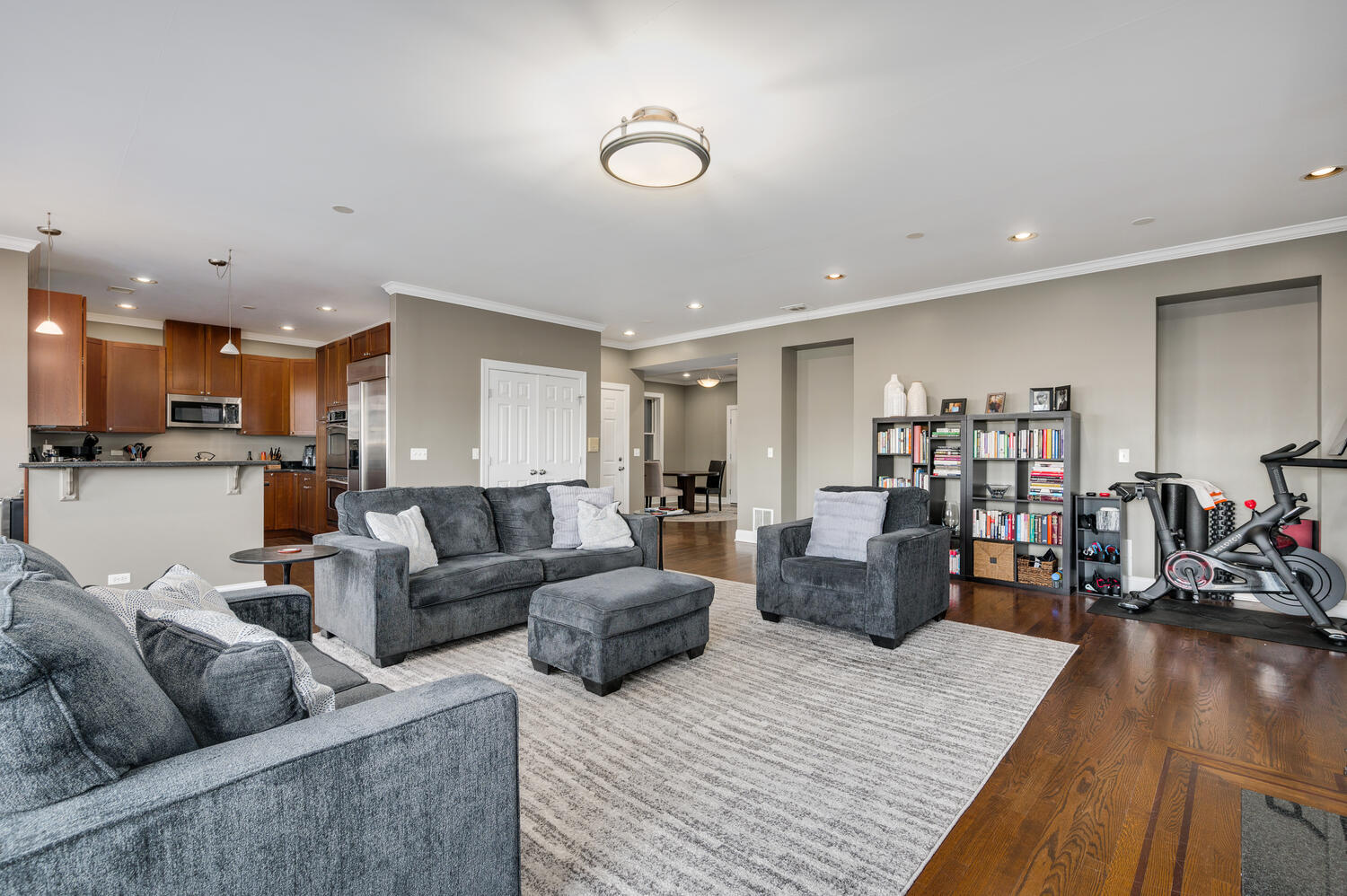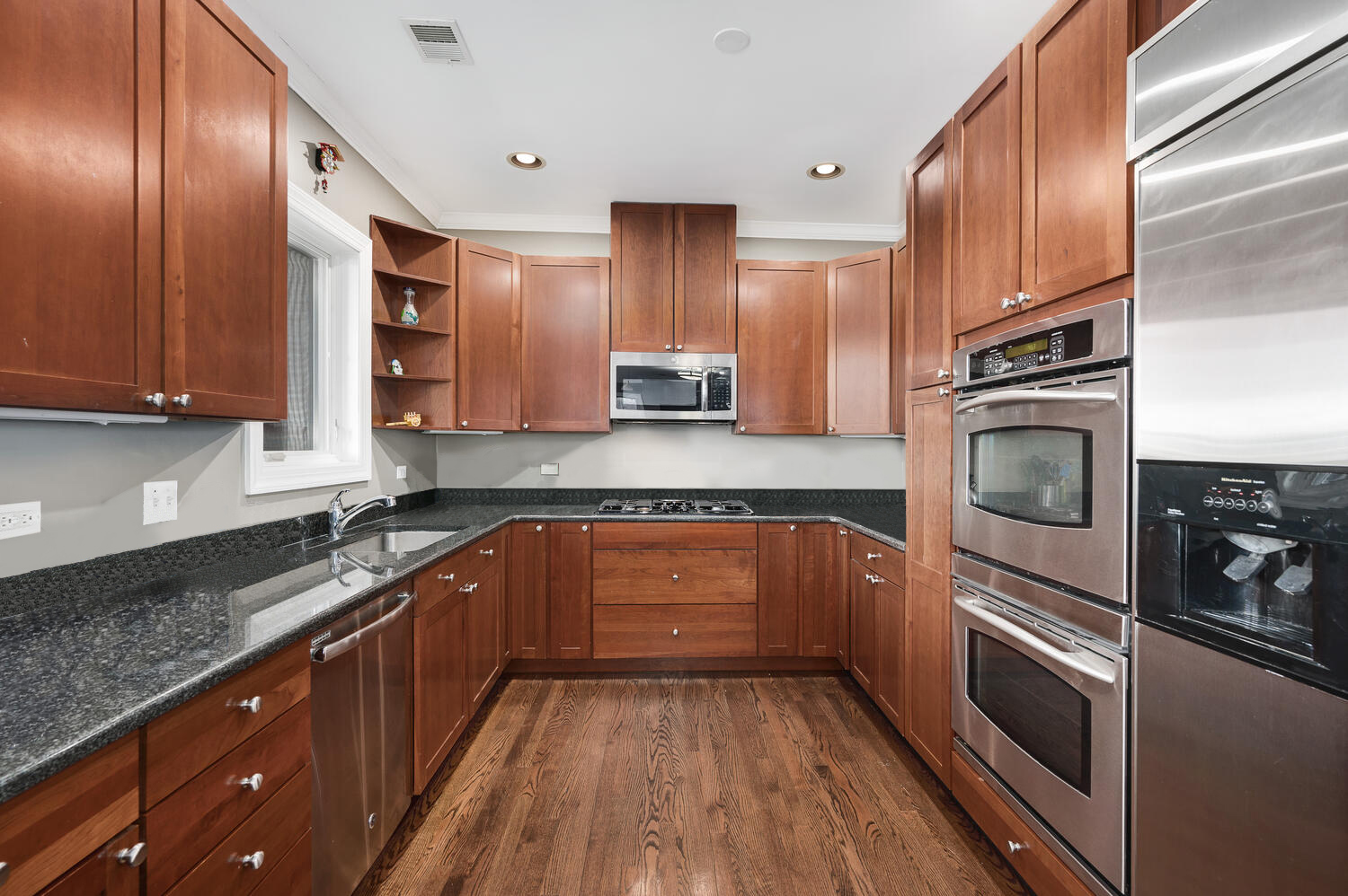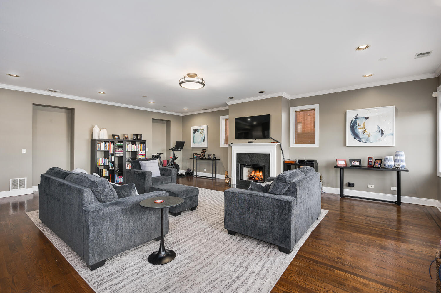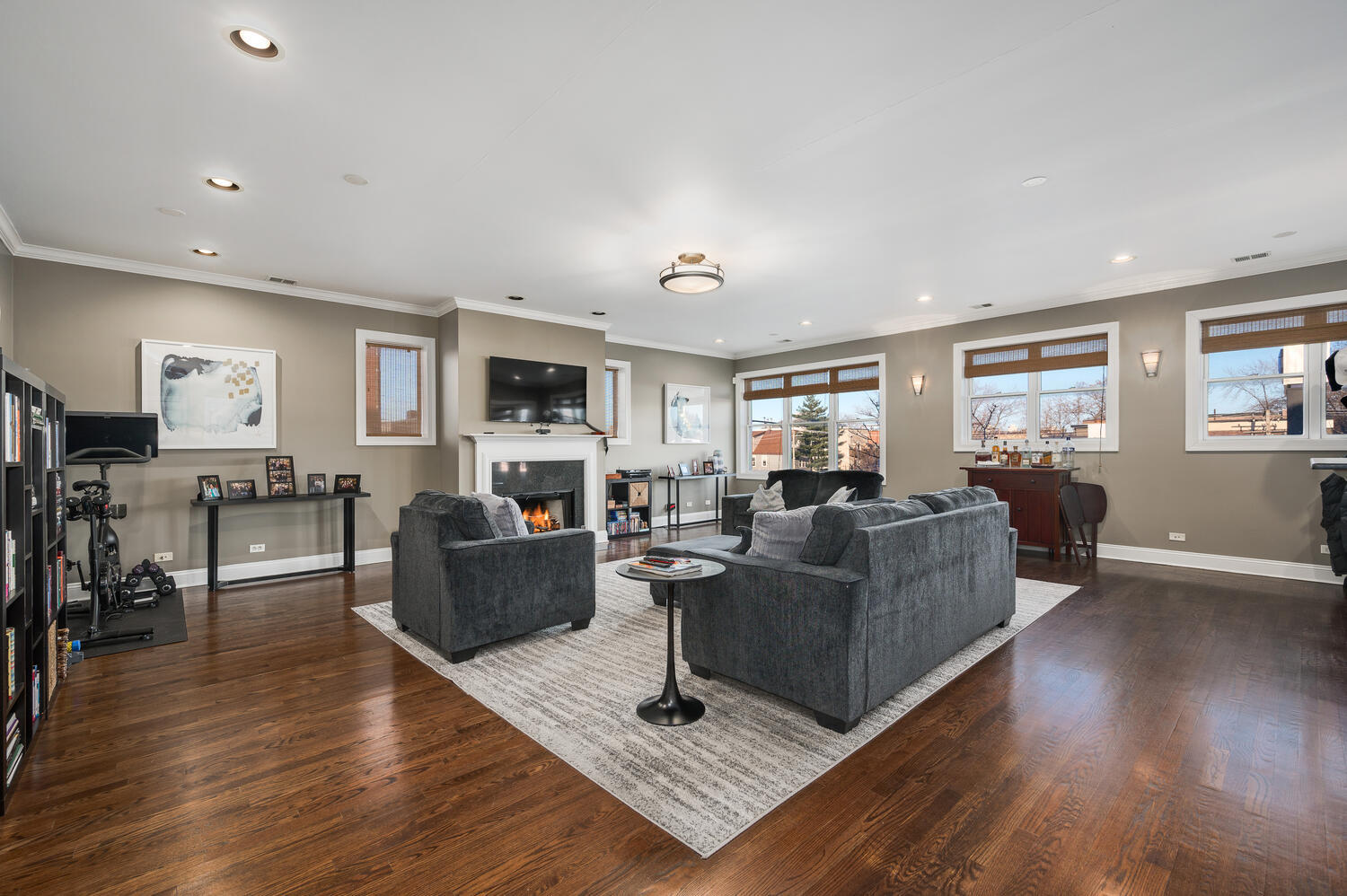 Extra wide three bedroom plus den condo in the heart of Chicago's iconic Southport Corridor/Lake View neighborhood. This 2400 square foot home has amazing outdoor spaces and THREE car parking! Beautifully upgraded kitchen with all stainless appliances and ample cabinetry. Extra wide, open floor plan in the living room dining, kitchen makes this feel like a super wide lot home, all with access to one of two outdoor spaces. The primary suite offers a great walk-in closet and a beautiful spa-like bath. Two additional generously sized bedrooms, one is ensuite, and access to a large west-facing terrace that spans the great width of the home. Located in the Hamilton school district, a half block from Whole Foods, and walking distance to the Brown line train.