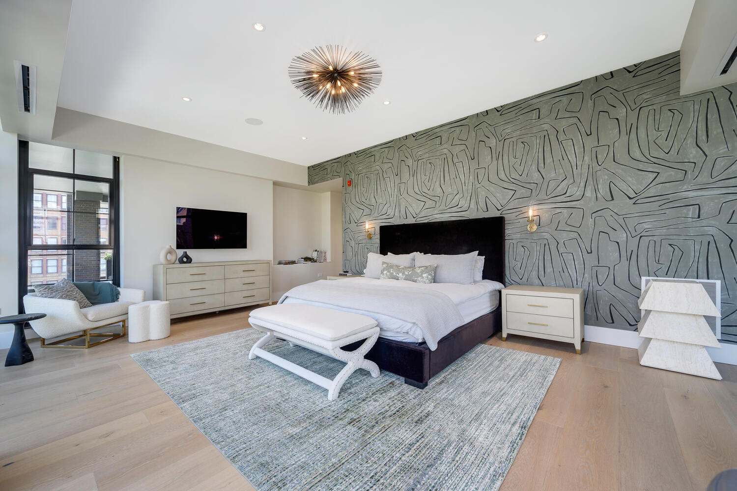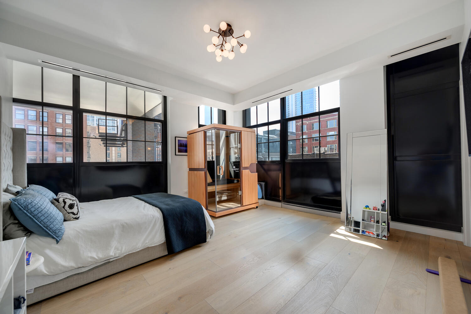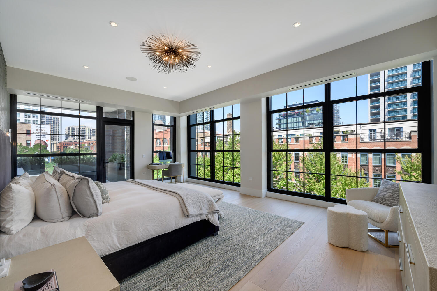This SoHo inspired full floor home has been perfectly curated by its interior designer owner. With direct elevator access into 4500 square feet of single level living, plus 1500 square feet of covered, landscaped outdoor living, this is single family style living in the best River North location. Direct elevator access into the gracious foyer invites you into the amazingly sunny living space surrounded by floor to ceiling loft style windows with views for days. With wide open living spaces, this better than new home was designed with entertaining in mind and flexible spaces. The kitchen is a chef's dream with top end appliances including Miele, Wolf, and Subzero, an oversized island with seating to accommodate the entire family, a beautiful Ann Sacks backsplash, and designer lighting. A separate catering space/butler pantry offers incredible tucked away storage with additional beverage refrigeration and a prep sink. The marble wet bar located off the living and dining room makes hosting a breeze with additional refrigeration and storage. A large great room off the kitchen is the perfect spot for informal gathering or a perfect play space. The south wing of the home features three spacious bedroom suites, all that have been fabulously finished and designed. A thoughtfully designed laundry room can also be found off the bedroom wing with side-by-side washer and dryer, built-in ironing board, quartz countertops and a sink. The expansive and luxurious primary suite is located in the northwest corner of the home and offers a coffee bar, sensational windows, and a private terrace - a true retreat. A fabulously finished closet/dressing room and a serene bath with heated floors, dual vanities plus a makeup vanity, and a separate tub and shower. The professionally designed and landscaped wrap around terrace is an extension of your living space with porcelain pavers, incredible city views, outdoor speakers, plus direct gas line for the firepit and grill. Additional upgrades include a whole house Sonos system and automated lighting and window treatments. Perfectly designed and finished for the most sophisticated city dweller, this home offers an opportunity for chic city living in a happening locale - plus attached garage parking for two cars! Step right outside of your front door to iconic city dining, the river, or an easy stroll to the Gold Coast.