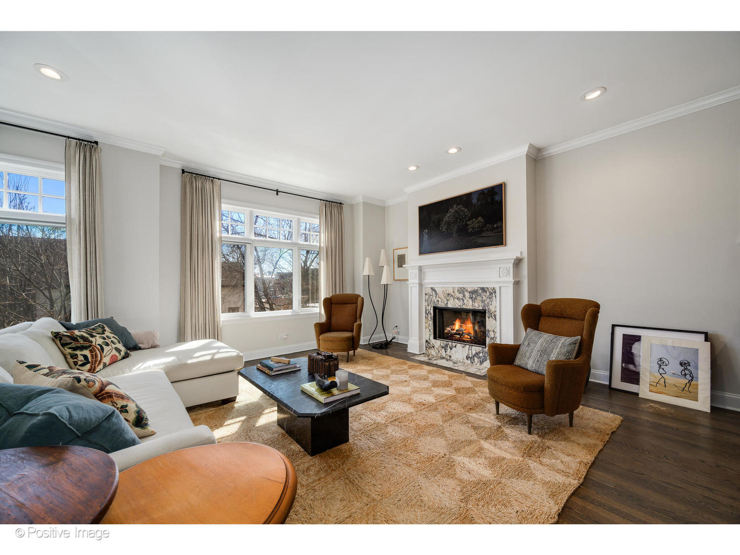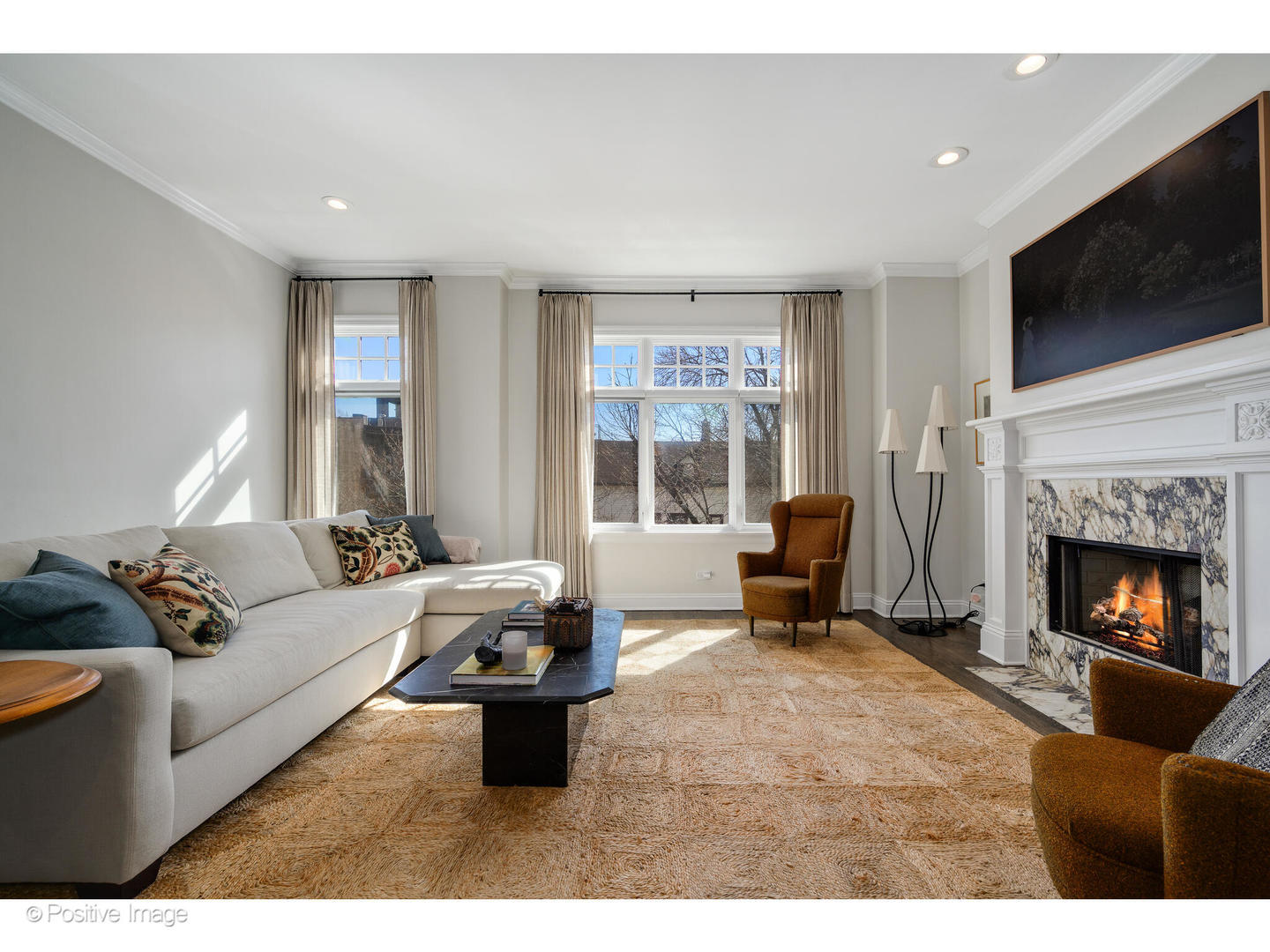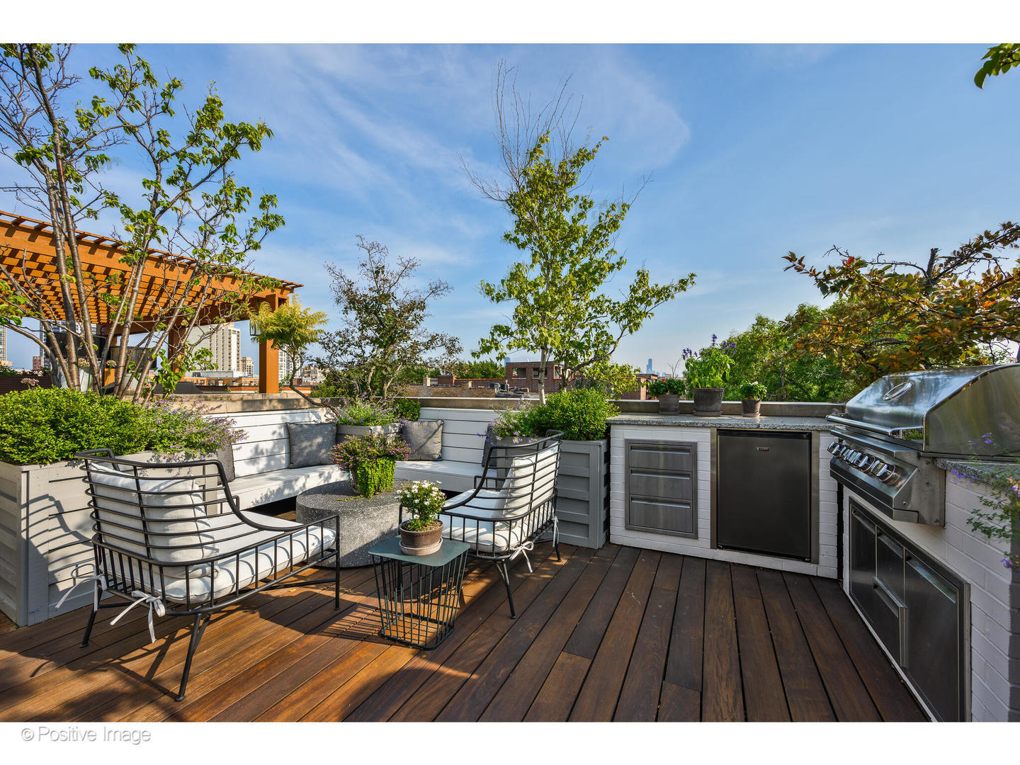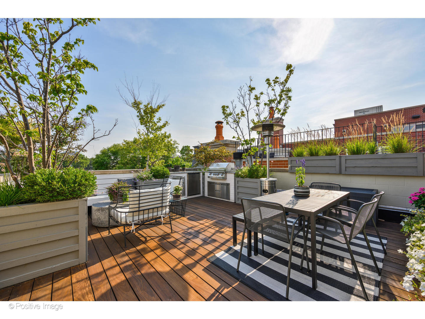 This is a rare opportunity to own an extra-wide Lincoln Park duplex-up in one of Chicago's most coveted neighborhoods, set on a quiet, tree-lined street with incredible outdoor space! Originally built by Environs, this three-bedroom, two-bath residence lives like a single-family home, offering exceptional width, soaring ceilings, and thoughtfully curated designer finishes throughout. The main level greets you with a sun-filled, open-concept living and dining space anchored by a fireplace framed in Calacatta Viola marble. The kitchen is designed for both everyday living and entertaining, featuring quartz countertops, an oversized island with bar seating, Rejuvenation hardware, Newport Brass faucet, and Visual Comfort pendant lighting. Rich hardwood floors run throughout, enhancing the home's timeless yet contemporary aesthetic. Two main-level bedrooms provide flexible living options. The chic first bedroom boasts a spacious walk-in closet and Soho Home light fixture, while the second features vaulted ceilings and a more intimate, design-forward atmosphere - ideal as a guest room, office, or den - with direct access to a private secondary balcony. An updated hall bath and abundant storage complete the level. Upstairs, the primary suite offers a serene retreat with vaulted ceilings and skyline views. The spa-inspired bath is appointed with dual vanities featuring Rejuvenation mirrors, a soaking tub, and a separate walk-in shower, along with generous built-in storage. A substantial walk-in closet, laundry area, and additional storage complete this private level. The fabulous expansive rooftop terrace is accessible from the second floor without passing through the primary bedroom. With sweeping skyline views, a built out outdoor kitchen, dedicated lounge and dining areas, a built-in irrigation system, and a retractable roof, this space is an urban oasis designed for seamless indoor-outdoor entertaining. One garage parking spot included with communal storage located above garage! Just steps from the dining, shopping, and neighborhood amenities along Clark, Broadway and Halsted, easy public transit, and PK-8 Alcott College Prep, this design-forward residence combines scale, style, and exceptional outdoor living in the heart of Lincoln Park!