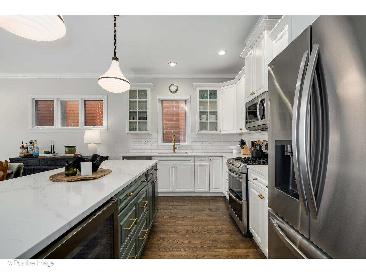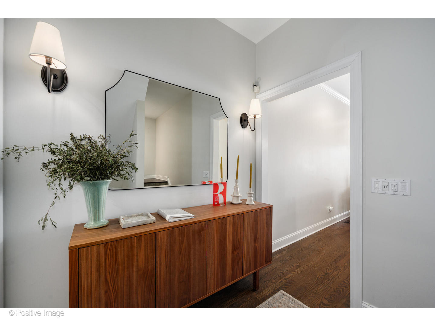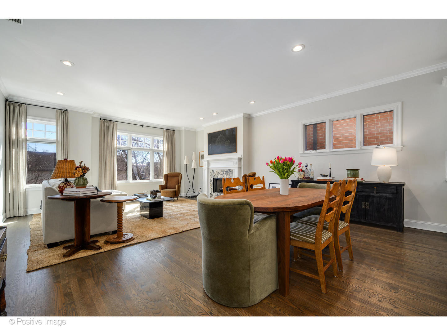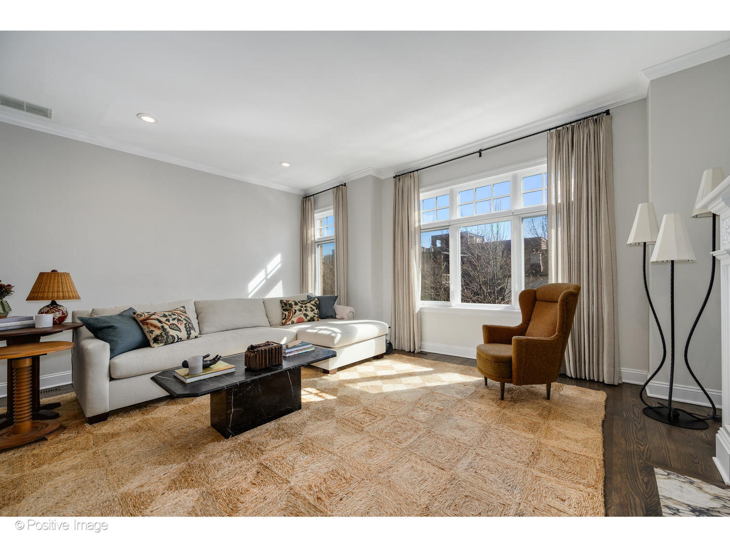 This is a rare opportunity to own an extra-wide Lincoln Park duplex-up in one of Chicago's most coveted neighborhoods, set on a quiet, tree-lined street with incredible outdoor space! Originally built by Environs, this three-bedroom, two-bath residence lives like a single-family home, offering exceptional width, soaring ceilings, and thoughtfully curated designer finishes throughout. The main level greets you with a sun-filled, open-concept living and dining space anchored by a fireplace framed in Calacatta Viola marble. The kitchen is designed for both everyday living and entertaining, featuring quartz countertops, an oversized island with bar seating, Rejuvenation hardware, Newport Brass faucet, and Visual Comfort pendant lighting. Rich hardwood floors run throughout, enhancing the home's timeless yet contemporary aesthetic. Two main-level bedrooms provide flexible living options. The chic first bedroom boasts a spacious walk-in closet and Soho Home light fixture, while the second features vaulted ceilings and a more intimate, design-forward atmosphere - ideal as a guest room, office, or den - with direct access to a private secondary balcony. An updated hall bath and abundant storage complete the level. Upstairs, the primary suite offers a serene retreat with vaulted ceilings and skyline views. The spa-inspired bath is appointed with dual vanities featuring Rejuvenation mirrors, a soaking tub, and a separate walk-in shower, along with generous built-in storage. A substantial walk-in closet, laundry area, and additional storage complete this private level. The fabulous expansive rooftop terrace is accessible from the second floor without passing through the primary bedroom. With sweeping skyline views, a built out outdoor kitchen, dedicated lounge and dining areas, a built-in irrigation system, and a retractable roof, this space is an urban oasis designed for seamless indoor-outdoor entertaining. One garage parking spot included with communal storage located above garage! Just steps from the dining, shopping, and neighborhood amenities along Clark, Broadway and Halsted, easy public transit, and PK-8 Alcott College Prep, this design-forward residence combines scale, style, and exceptional outdoor living in the heart of Lincoln Park!