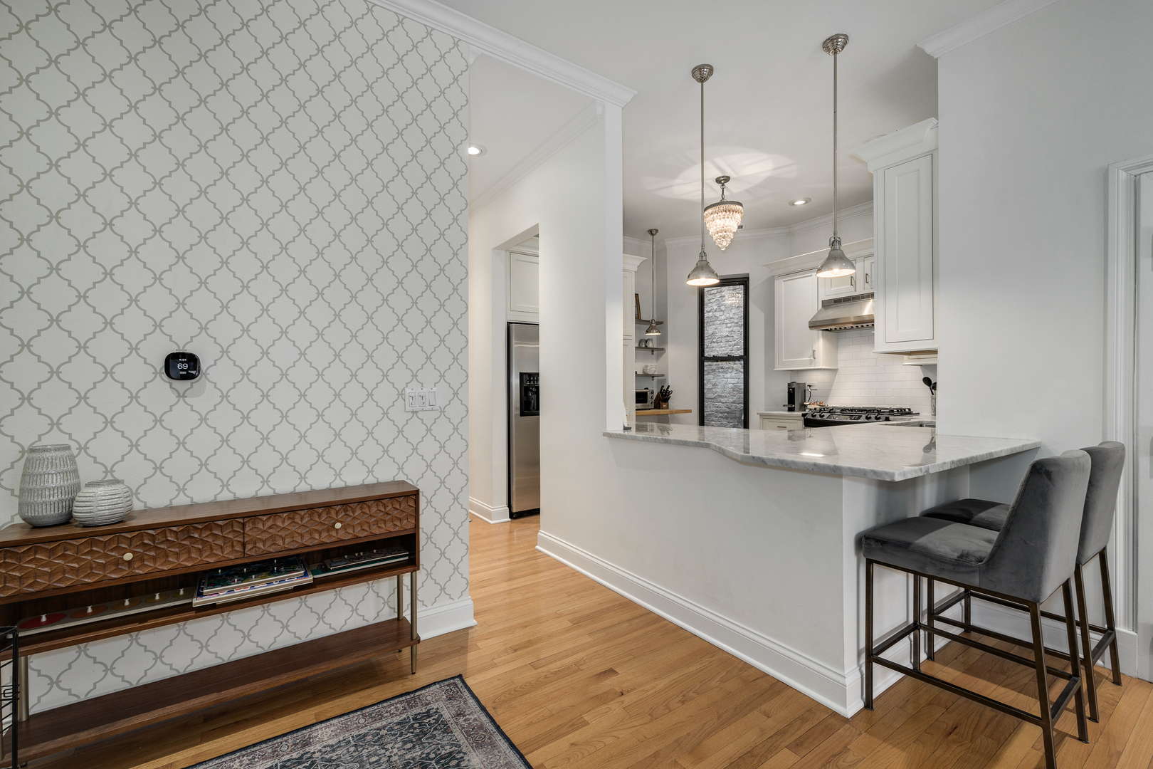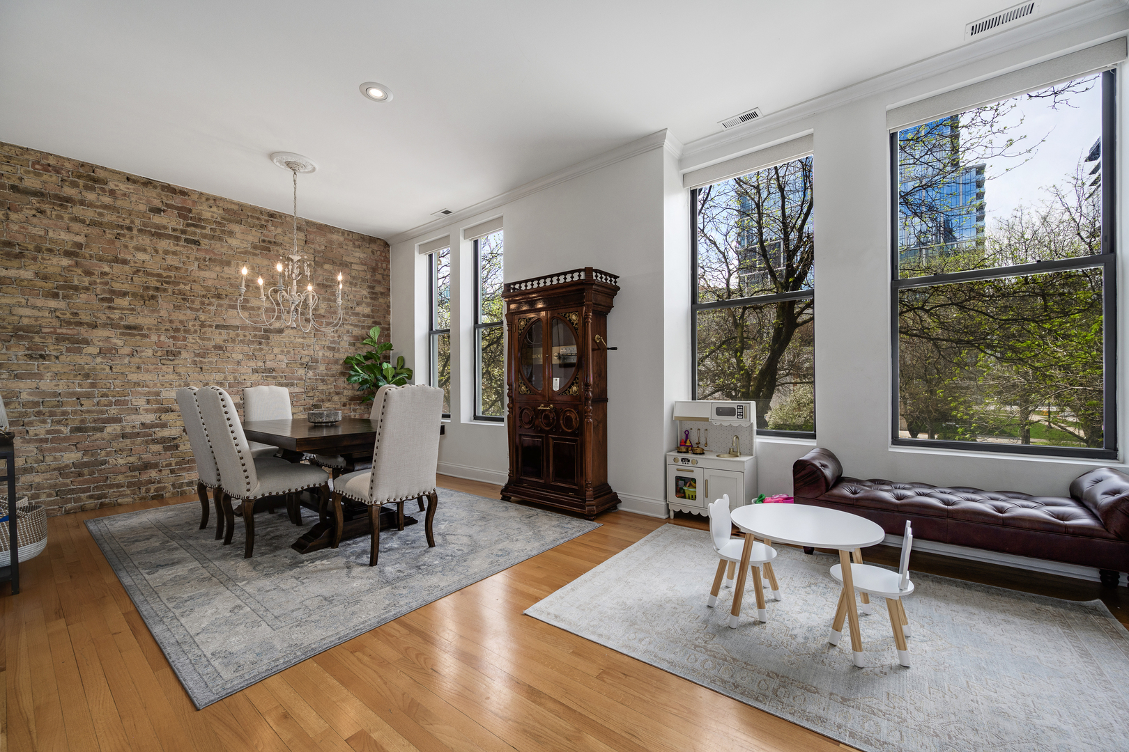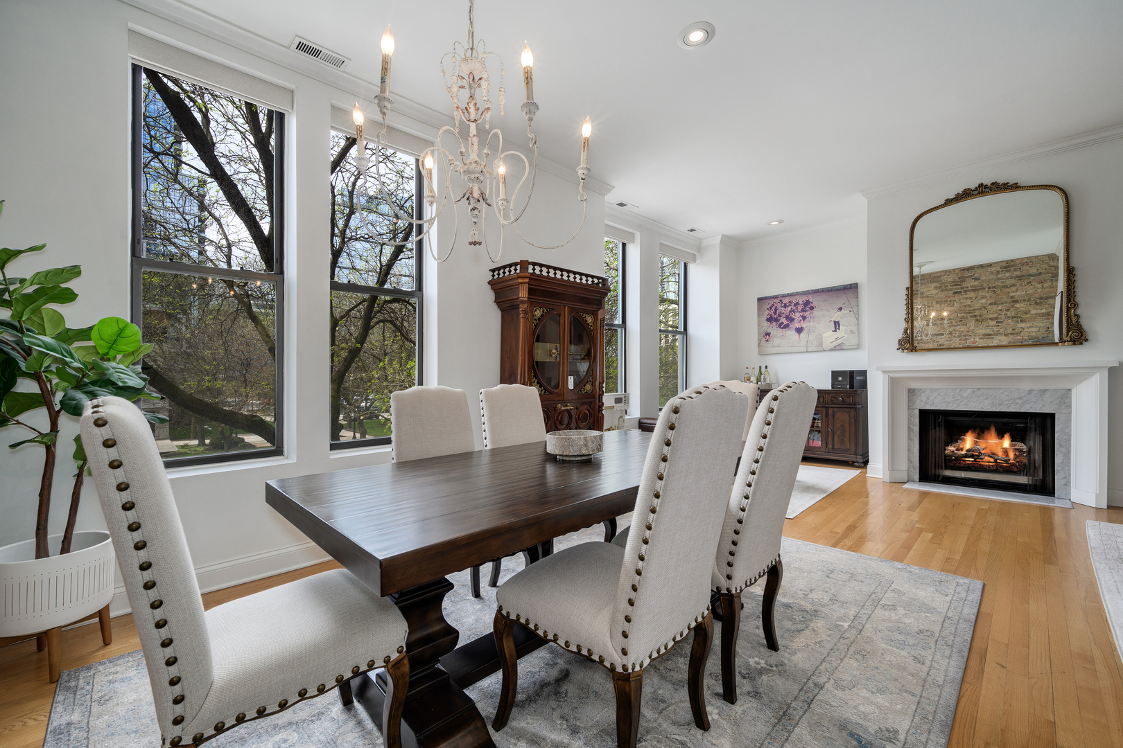Exceptional three-bedroom, two bath residence ideally positioned in the heart of the Gold Coast, where timeless architecture meets thoughtfully curated modern design. This home offers the very best of city living with both sophistication and ease. Originally known as The LaSalle Plaza Hotel, this intimate eight-unit boutique elevator building was thoughtfully converted and remains beautifully maintained, seamlessly blending its storied past with today's modern living. No detail was overlooked in this home! The large white kitchen is chic and elevated, featuring beautiful countertops, stainless steel appliances, a butcher block prep area, and island seating - living like that of a single-family home. Expansive living and dining spaces are flooded with natural light through oversized west-facing windows, offering serene treetop views. Extra high 10-foot ceilings, exposed brick, rich oak hardwood floors, and two wood-burning fireplaces create a warm yet refined atmosphere. The oversized living area offers incredible flexibility for entertaining, relaxing, or working from home, while the separate dining space allows for effortless everyday living. The primary suite is a true standout, offering access to the private balcony space, a walk-in closet, and a spa-like bath with dual sinks, a marble walk-in shower, and a clean, timeless aesthetic. The second bedroom is generously sized and works beautifully as either a guest room or office. The third bedroom is especially inviting, complete with a second wood-burning fireplace, excellent closet space, and additional access to the private outdoor space. A hip/moody hall bath and a dedicated laundry room with great storage complete the home. Designed for modern living, the home also includes built-in Sonos speakers, a generous 10x8 private storage room, and secured on-site parking. The building offers a refined, European-inspired feel, highlighted by a beautiful lobby. Ideally located just steps from Washington Square Park and the Newberry Library, and moments from the lakefront and Michigan Avenue, this home provides unparalleled access to the very best of city living. One parking space too!